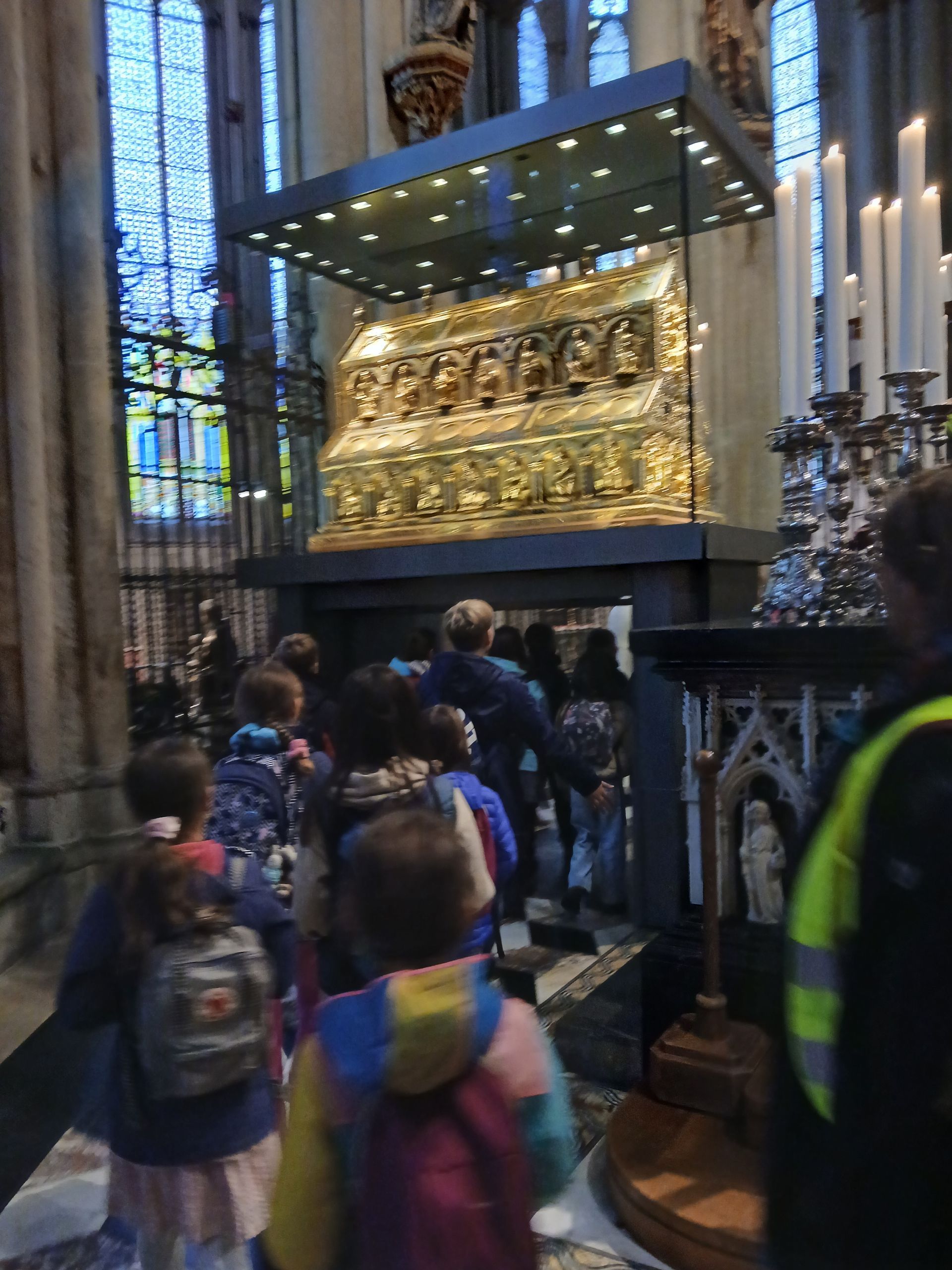 Die katholischen Religionskinder der Stufe 4 von der GGS Maria-Sybilla-Merian-Schule durften in diesem Jahr wieder an der Domwallfahrt in Köln teilnehmen. Mit dem Bus ging es zur Kirche Groß-Sankt-Martin, wo wir mit einem Gottesdienst starteten. Wir fanden das einladende Schauspiel von Himmel und Erde zum Themenlied wirklich schön. Dann gingen wir in einer großen Prozession mit anderen Grundschulen zum Dom. Hier durften wir unter dem Schrein der Heiligen Drei Könige durchgehen. Am Ausgang gab es auch eine leckere kleine Überraschung, die wir kosten durften. Das war ein tolles Erlebnis! Und ab jetzt werden wir versuchen, andere Wege zu gehen, damit Himmel und Erde sich immer näherkommen.